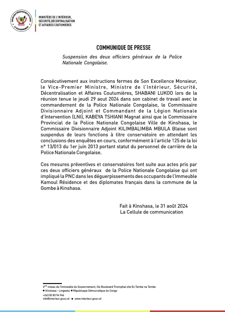 « Ces mesures préventives et conservatoires font suite aux actes pris par ces deux officiers généraux de la Police Nationale Congolaise qui ont impliqué la PNC dans les déguerpissements des occupants de l’Immeuble Kamoul Résidence et des diplomates français dans la commune de la Gombe à Kinshasa», lit-on dans ce communiqué.