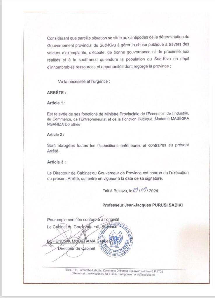 MASIRIKA NGANIZA Dorothée, Ministre provinciale de l’Économie, de l’Industrie, du Commerce, de l’Entrepreneuriat et de la Fonction Publique a été relevée de ses fonctions, d’après un arrêté signé par le Gouverneur Jean-Jacques Purusi.