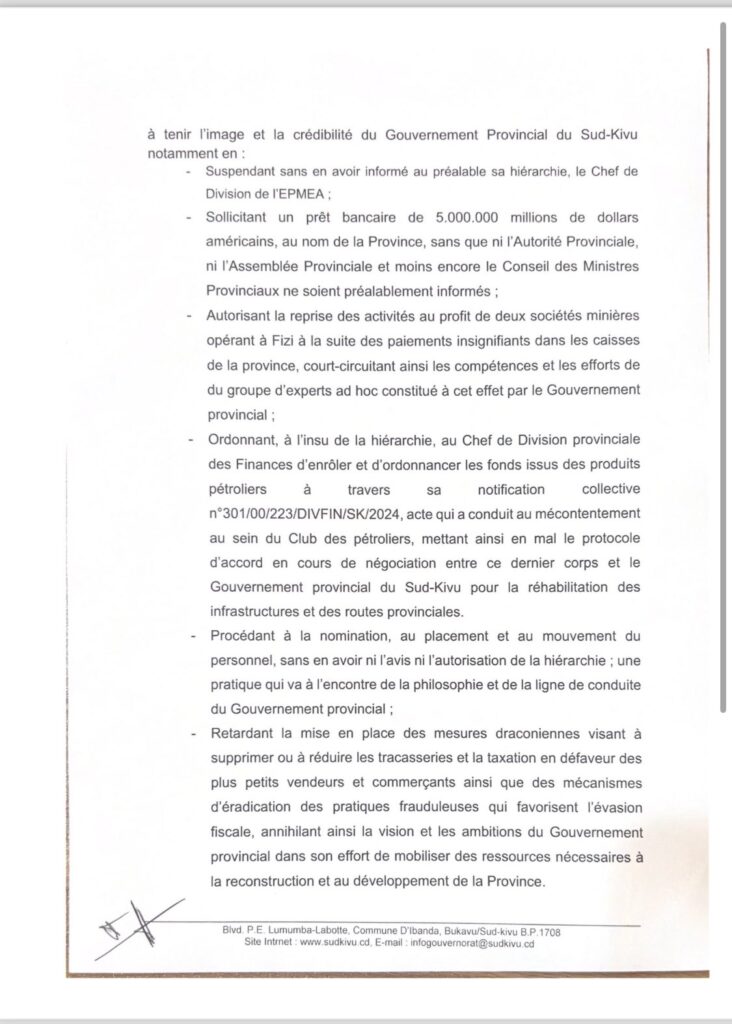 Il lui est reproché d’avoir posé “des actes coupables, répréhensibles et préjudiciables de nature à tenir l’image et la crédibilité du Gouvernement provincial du Sud-Kivu”