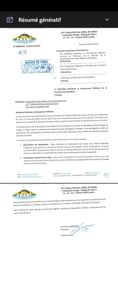 À travers cette même correspondance, le maire de la ville annonce l’interdiction de la marche prévue ce mercredi par le « Mouvement National Congolais » pour protester contre la tenue du Festival Amani à Goma alors que la situation sécuritaire dans l’Est du pays continue à se détériorer.