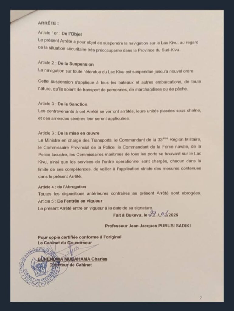 Conscient de la gravité de la situation, le Gouverneur du Sud-Kivu, Jean-Jacques Purusi, a signé ce mercredi 29 janvier 2025, un arrêté portant mesure de suspension de la navigation sur le Lac Kivu.