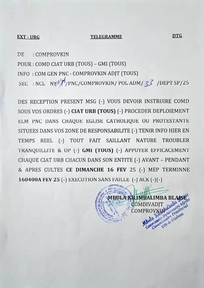 De son côté, le commissaire provincial de la Police à Kinshasa annonce le déploiement de ses éléments « dans chaque paroisse catholique ce dimanche avant, pendant et après le culte ». Dans un télégramme dont une copie nous est parvenue ce même samedi, le commandant des forces de l’ordre de la ville, le Général Blaise Kilimbalimba, dit prévenir tout trouble à l’ordre public dans ces lieux de culte.