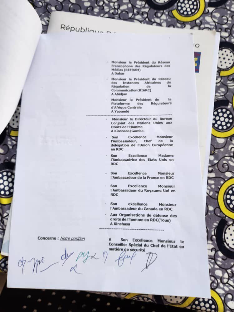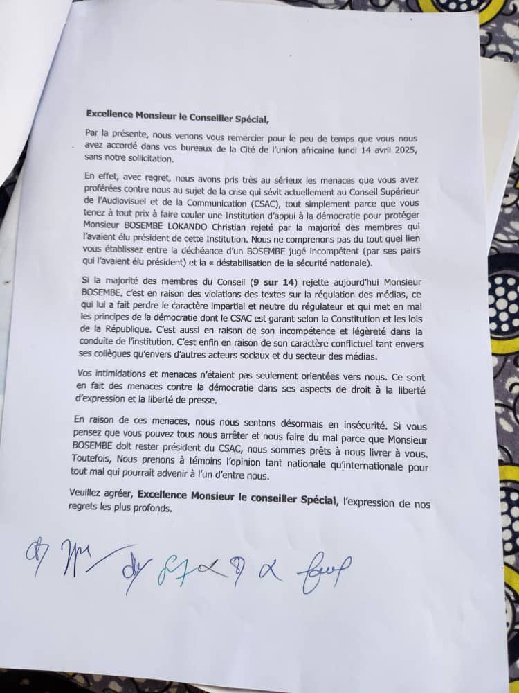 Dans une lettre adressée avec copie au patron de l’ONU, à l’UE, au PR Félix Tshisekedi, à Vital Kamerhe président de l’Ass. Nat. à Sama Lukonde président du Sénat , aux ambassades ainsi qu’aux organisations panafricaines, 9 des 14 membres de la plénière du CSAC RDC opposés à Christian BOSEMBE président en exercice de cette institution, révèlent avoir été menacés, lundi 14 avril par le conseiller spécial du chef de l’Etat en matière de sécurité, Désiré – Casimir Kolongele Eberande.