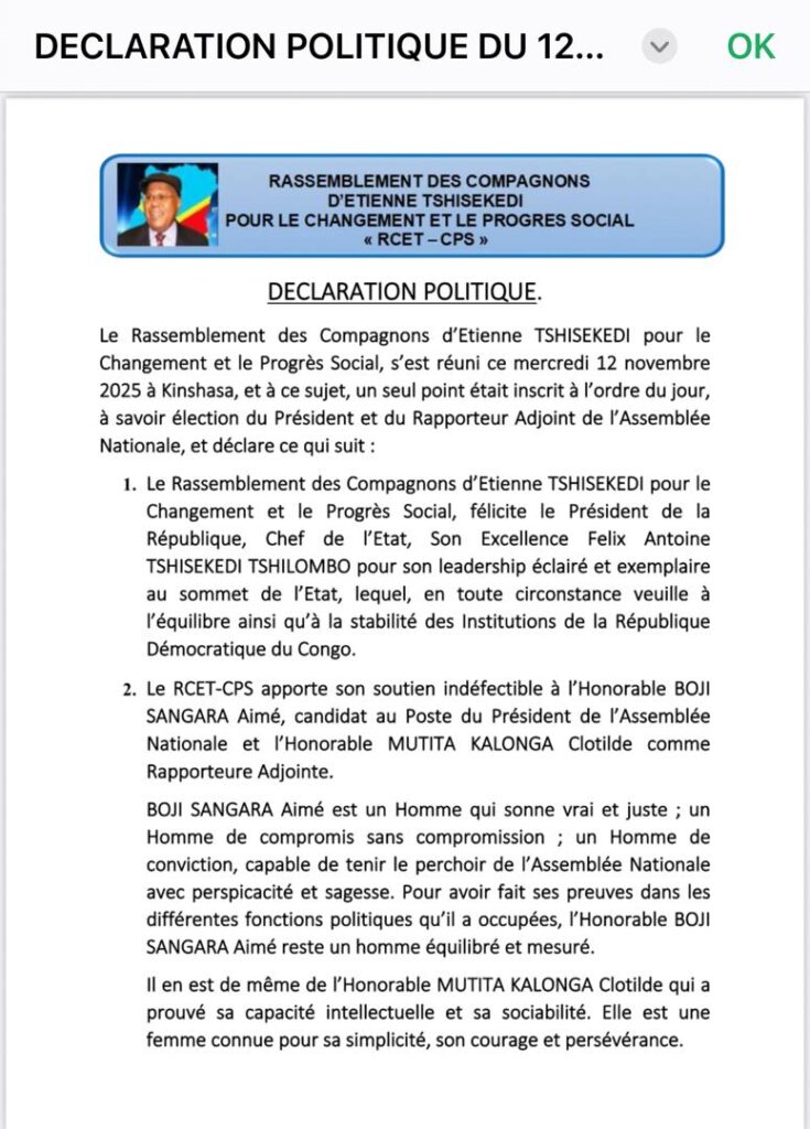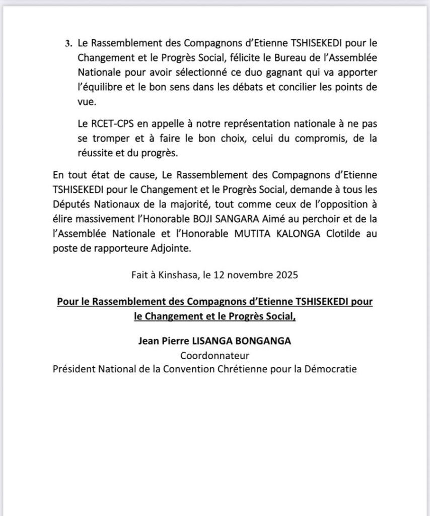 Dans déclaration politique faite ce mercredi 12 novembre à Kinshasa, le RCET-CPS a félicité le bureau de la chambre basse du Parlement pour le choix judicieux porté sur ces 2 candidats épris de valeurs et dont le parcours politique est irréprochable. Par la même le RCET-CPS a appelé les élus à élire ce ticket qui va apporter équilibre et bon sens dans les débats selon la vision du chef de l’État qui tient à la stabilité et l’équilibre au sein des institutions du pays. Déclaration