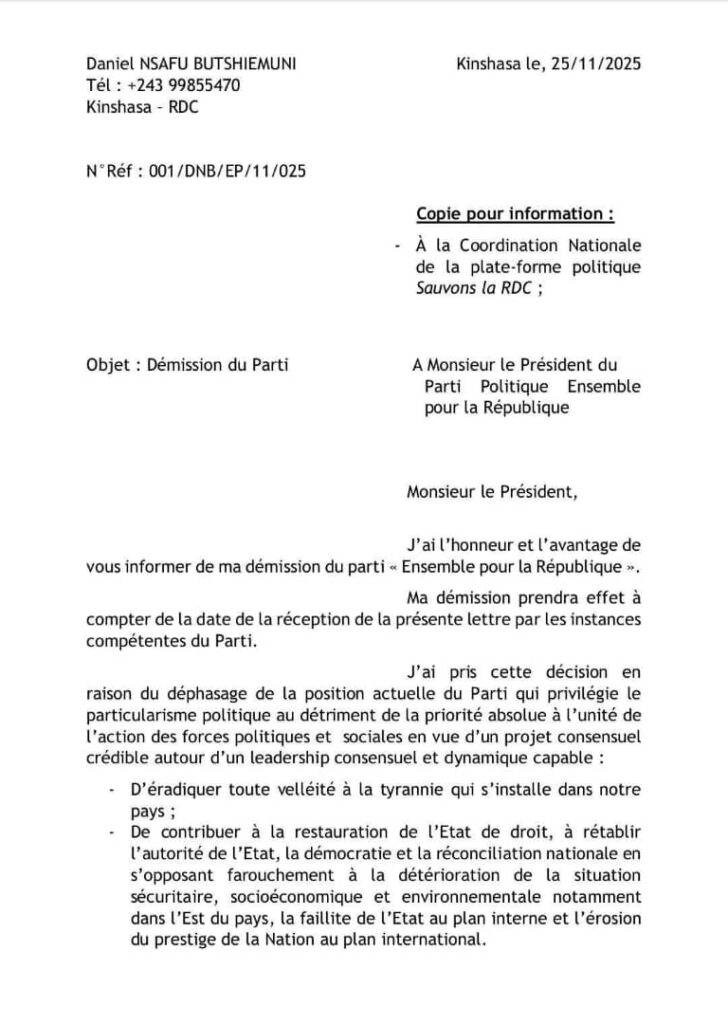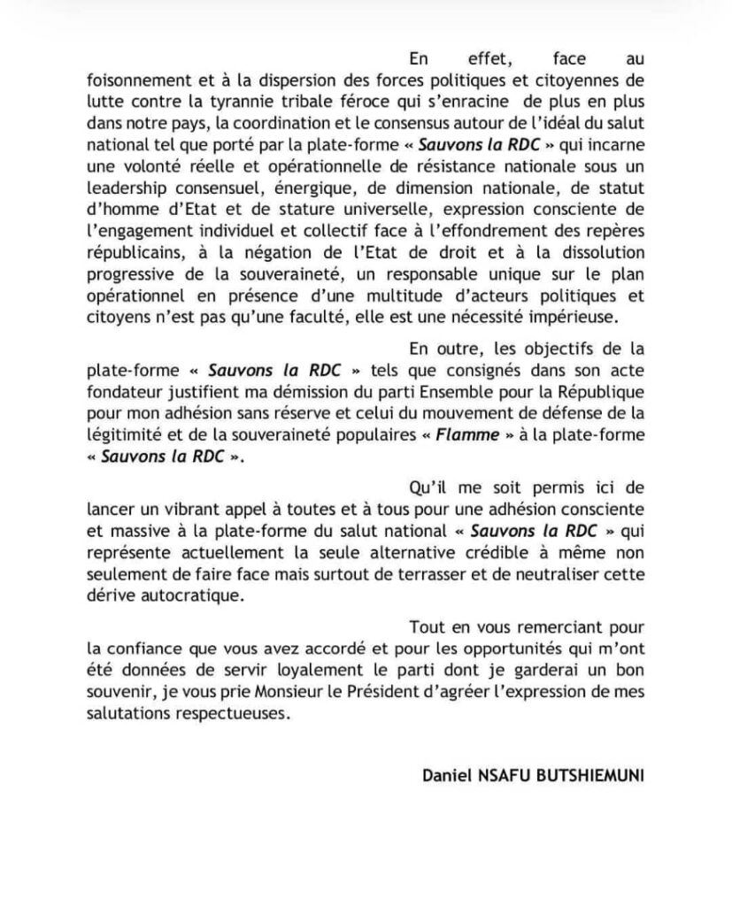 C’est désormais officiel, Daniel Nsafu Butshiemuni a annoncé sa démission du parti politique Ensemble pour la République, formation à l »opposant Moïse Katumbi, pour rejoindre la plateforme « Sauvons la RDC ».
