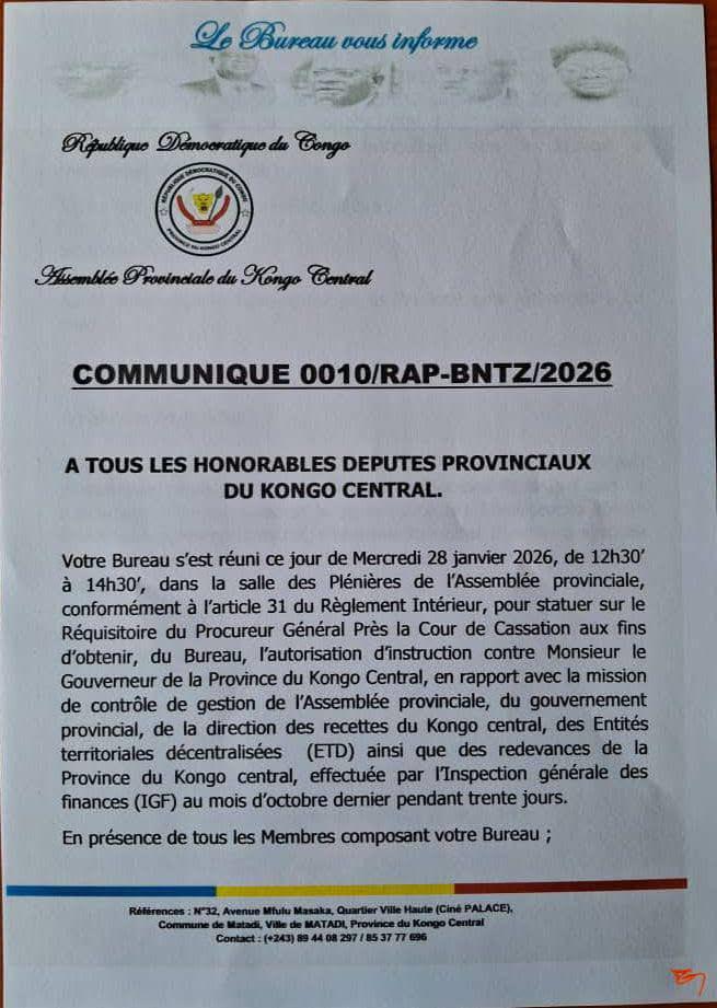 Le Bureau rappelle que le gouverneur du Kongo Central est « présumé innocent à ce stade » de la procédure.