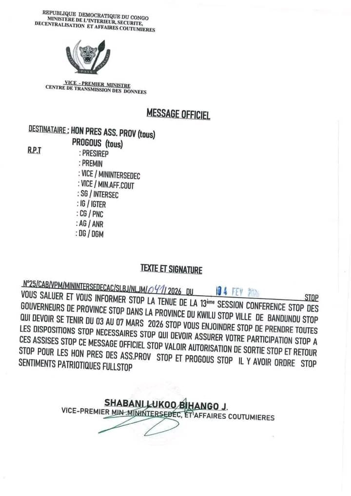 Initialement prévue en décembre dernier, cette importante rencontre entre l’exécutif national et les exécutifs provinciaux se tiendra finalement du mardi 03 au samedi 07 mars 2026, dans la province du Kwilu.